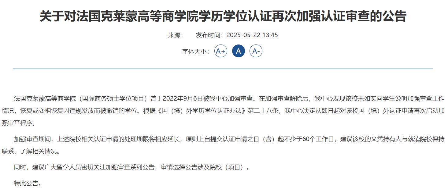 关于对法国克莱蒙高等商学院学历学位认证再次加强认证审查的公告