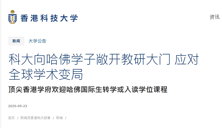5月23日,香港科技大学(简称“港科大”)宣布,向现正就读哈佛大学的国际本科生及研究生,以及持有哈佛学位课程录取通知的学生,发出公开邀请,欢迎他们加入港科大继续学业,延续学术追求。港科大表示,此举旨在应对全球学术环境的变化,并彰显港科大致力营造多元、世界级学习环境的承诺。该校将为有意转学的学生提供无条件录取、简化入学程序及学术支援,协助他们顺利过渡。