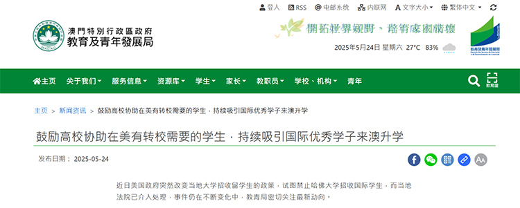 澳门特区政府教育及青年发展局24日表示,对于美国政府禁止哈佛大学招收国际学生的相关事件,教青局密切关注最新动向,鼓励澳门高校留意最新情况,为受影响的学生提供转学便利及协助,保障学生就学权益,具体措施将由各高校按实际情况订定。