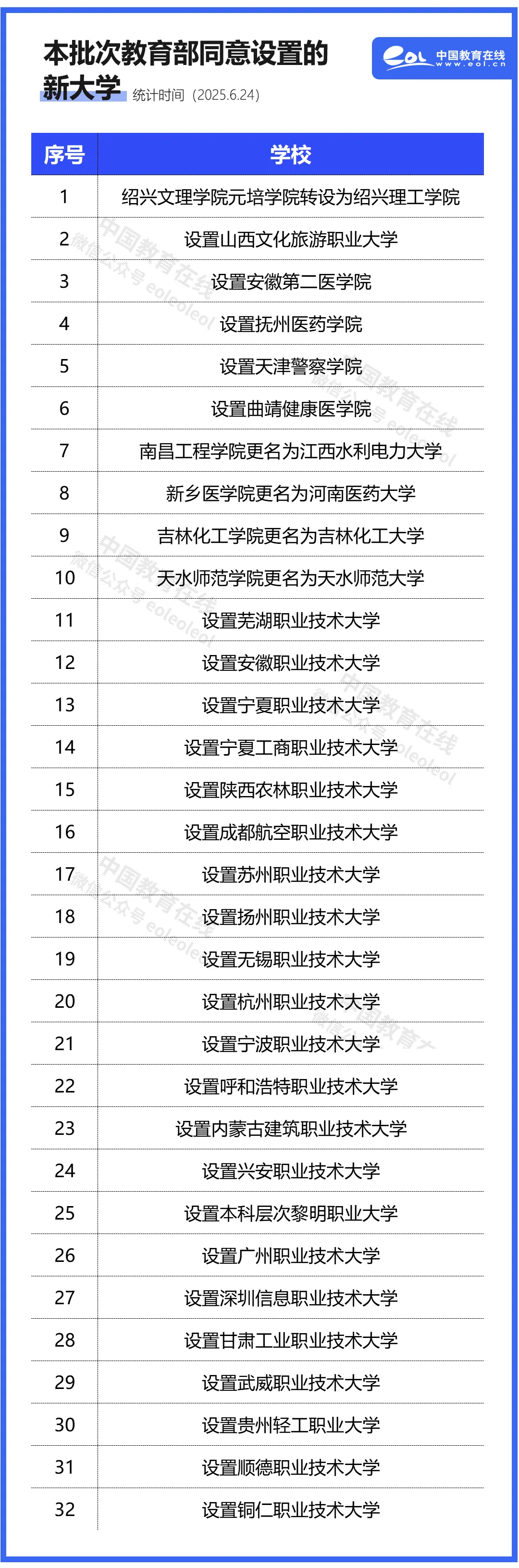 经梳理,此次同意设置的32所高校均为本科院校。其中:新设院校27所(包含23所职业本科院校)、独立学院转设高校1所、学校更名4所。