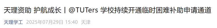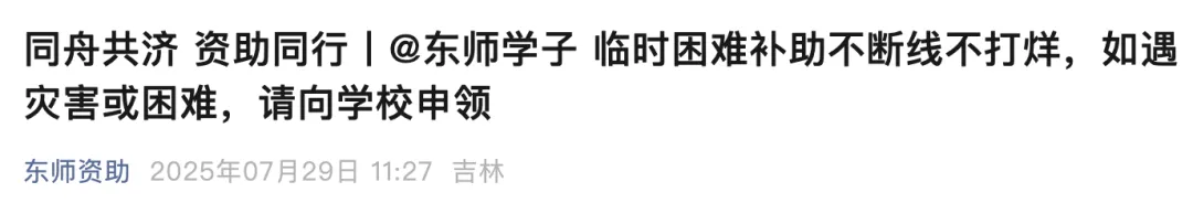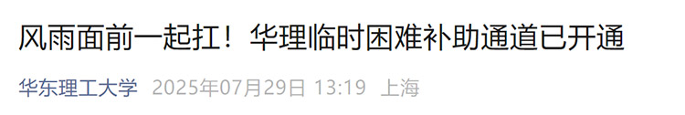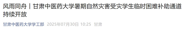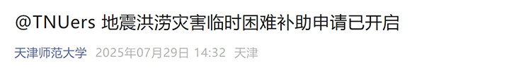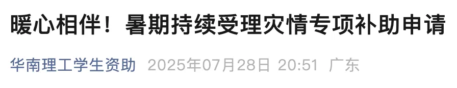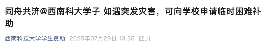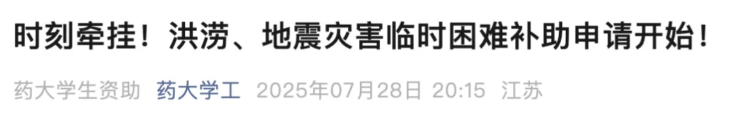 学校始终密切关注灾情的发展变化,时刻牵挂着每一位受灾害影响的同学。为及时做好救助帮扶工作,保障同学正常学习生活,学校已设立临时困难补助并持续开放,同学可根据需要随时申请。