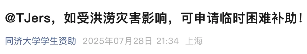 学校设立同济大学2025年暑期洪涝灾害专项补贴,如你及你的家庭受到暴雨洪涝灾害影响,请及时联系所在学院的辅导员申请。灾害无情,人间有爱!学校将持续关注受灾学生的情况,与大家共渡难关!