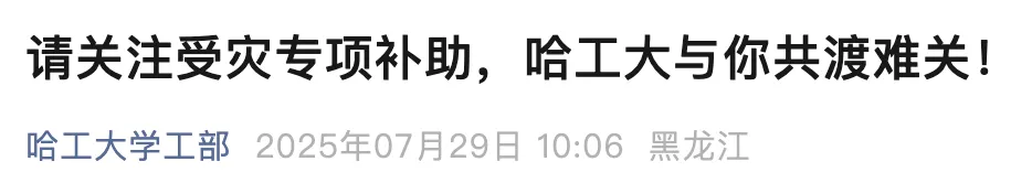 “困难不怕,哈工大是家”,学校时刻关心每一位同学,第一时间启动受灾学生摸排和受灾专项资助工作。如有受灾学生,请及时联系辅导员申请,也可与学生工作部取得联系!学校将为摸排出的受灾学生发放受灾专项补助,保障同学们安心学习生活。