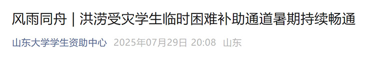 学校密切关注灾情变化,持续开通受灾家庭学生的临时困难补助通道。如有因突发灾害造成个人或家庭经济损失导致生活临时困难的同学,可通过智慧资助系统申请本科生临时困难补助/研究生助困专项基金。