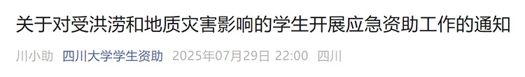 温馨提示:暑期因洪涝、地质等自然灾害导致家庭经济困难的2025级新生,入校后请及时告知班级辅导员,学校将开通受灾新生临时困难补助申请通道,为同学们排忧解难。