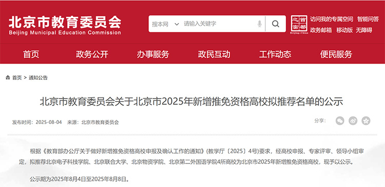 8月4日,北京市教委发布《关于北京市2025年新增推免资格高校拟推荐名单的公示》,拟推荐北京电子科技学院、北京联合大学、北京物资学院、北京第二外国语学院4所高校为北京市2025年新增推免资格高校。