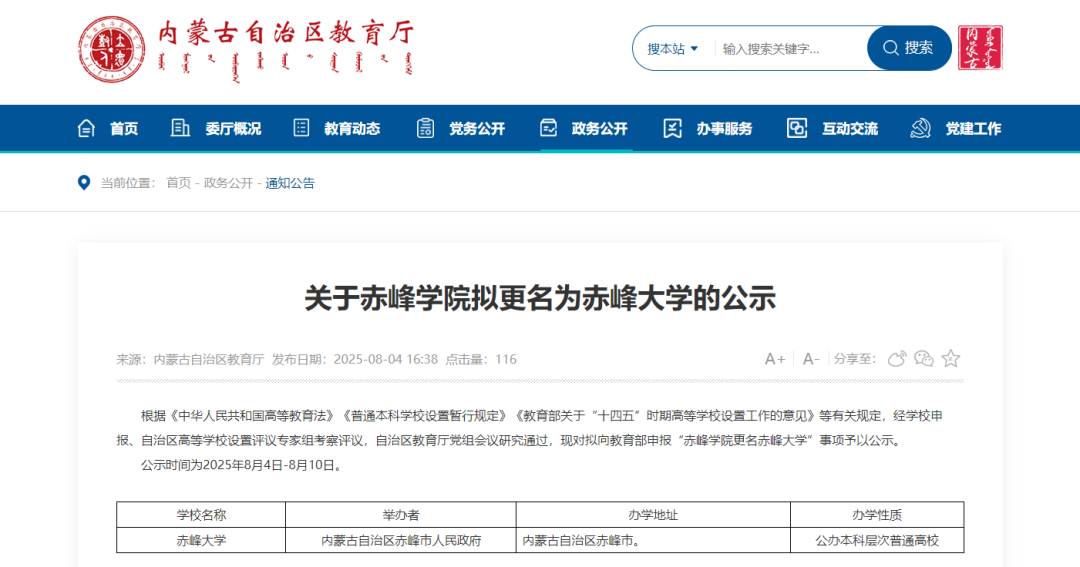 8月4日,内蒙古自治区教育厅发布《关于赤峰学院拟更名为赤峰大学的公示》。根据《中华人民共和国高等教育法》《普通本科学校设置暂行规定》《教育部关于“十四五”时期高等学校设置工作的意见》等有关规定,经学校申报、自治区高等学校设置评议专家组考察评议,自治区教育厅党组会议研究通过,现对拟向教育部申报“赤峰学院更名赤峰大学”事项予以公示。公示时间为2025年8月4日-8月10日。