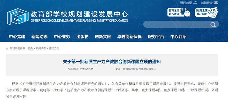 近日,教育部学校规划建设发展中心发布《关于第一批新质生产力产教融合创新课题立项的通知》。
