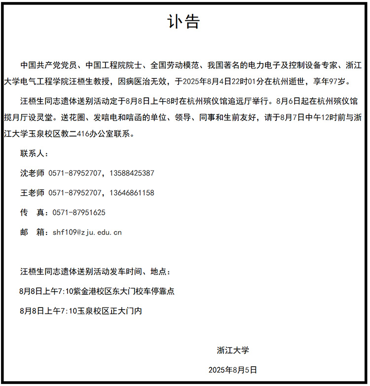 8月5日,浙江大学电气工程学院发布讣告:中国共产党党员、中国工程院院士、全国劳动模范、我国著名的电力电子及控制设备专家、浙江大学电气工程学院汪槱生教授,因病医治无效,于2025年8月4日22时01分在杭州逝世,享年97岁。