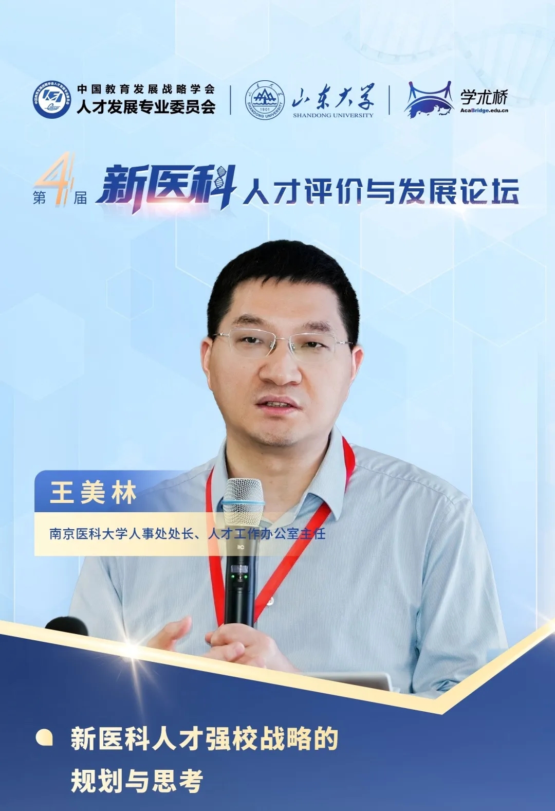 南京医科大学人事处处长、人才工作办公室主任王美林分享了南京医科大学在扩大师资规模、优化人才梯队、深化内涵建设及改革体制机制等方面取得的成效。学校建成了一支在师资规模、人才梯队结构、教师专业素质等方面基本适应学校发展需要的高水平师资队伍。以此为基础,提出以“党管人才”为根本原则,通过“精准引才、科学育才、高效用才”等六大重点工作,并实施“医工交叉人才雁阵计划”、“临床人才引育攻坚计划”等五大专项行动,构建全链条人才培养体系,引育并重,以支撑“双一流”建设和新医科高质量发展。