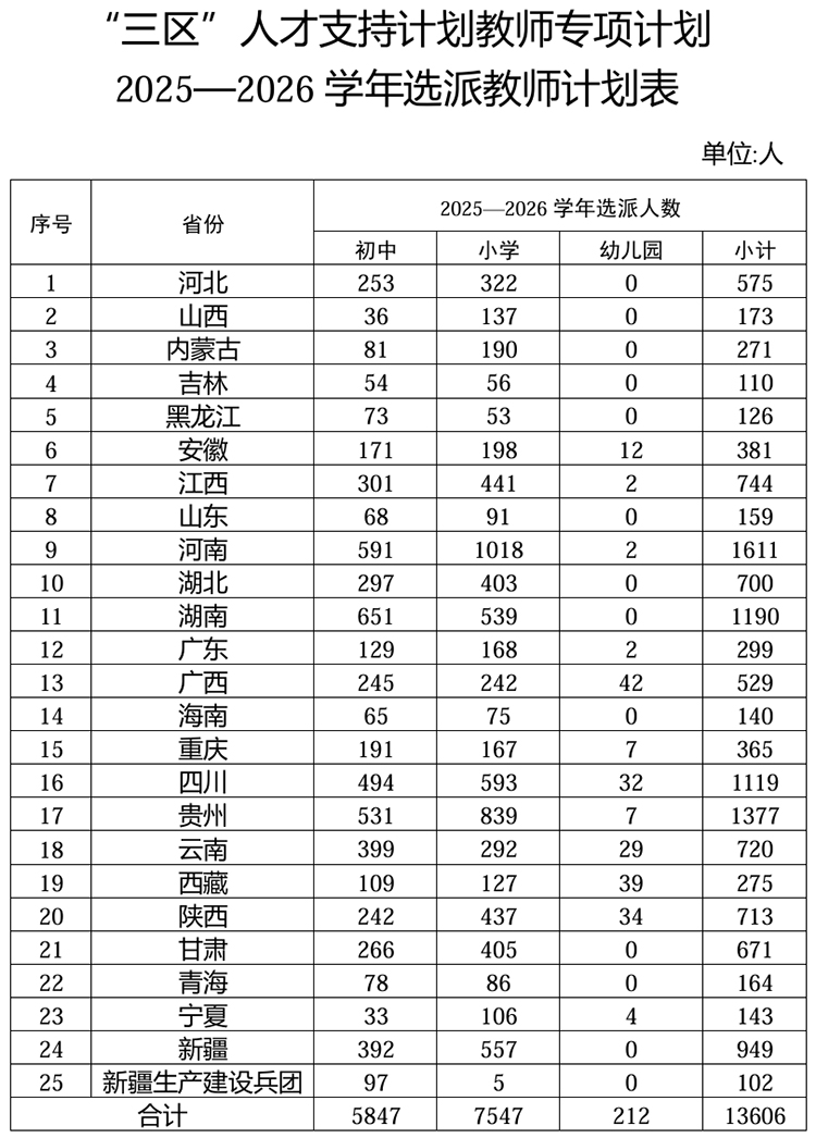 《通知》指出,2025—2026学年全国计划选派13606名教师,其中初中计划选派5847名,小学计划选派7547名,幼儿园计划选派212名。选派教师主要由各省(区、市)和新疆生产建设兵团在本行政区域范围内调配,调动省会城市、中心城市、非受援县的优质教师资源支持省内受援县。实施范围继续聚焦脱贫地区(原国家确定的连片特困地区、国家扶贫开发工作重点县、省级扶贫开发工作重点县及各地确定的其他深度贫困地区、新疆生产建设兵团困难团场),重点向国家乡村振兴重点帮扶县、“三区三州”等地区倾斜。