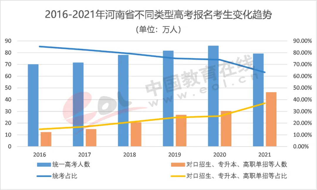 比如河南招办在2021年曾公开了当年高考报名人数的构成:高考报名人数125万中,参加普通高考即6月传统意义上高考的不足80万,仅有79万多。其他均为中职与专升本。
