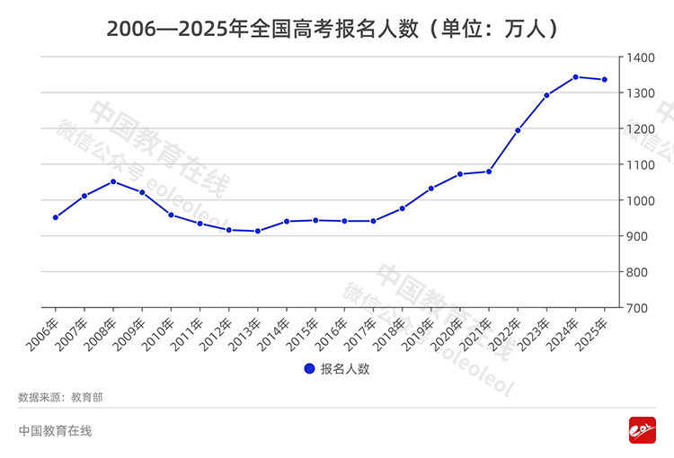 日前,教育部公布高考报名人数1335万,比去年的1342万略微下降7万人,和一些自媒体预测的增长到1400万以上差距悬殊。2025年高考考生主要对应的是2007年出生的人。当年新生儿1594万,比2006年增长了10万,但考生数量为什么下降?这是很多人想问的。