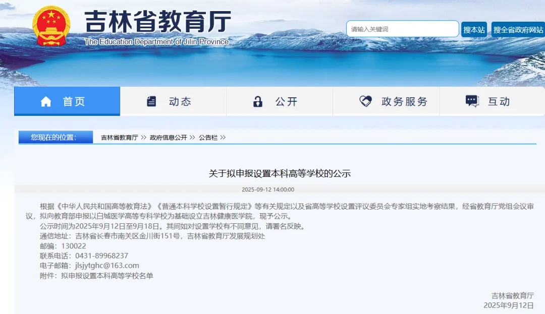 9月12日,吉林省教育厅发布《关于拟申报设置本科高等学校的公示》,根据相关规定以及省高等学校设置评议委员会专家组实地考察结果,经吉林省教育厅党组会议审议,拟向教育部申报以白城医学高等专科学校为基础设立吉林健康医学院。公示时间为2025年9月12日至9月18日。