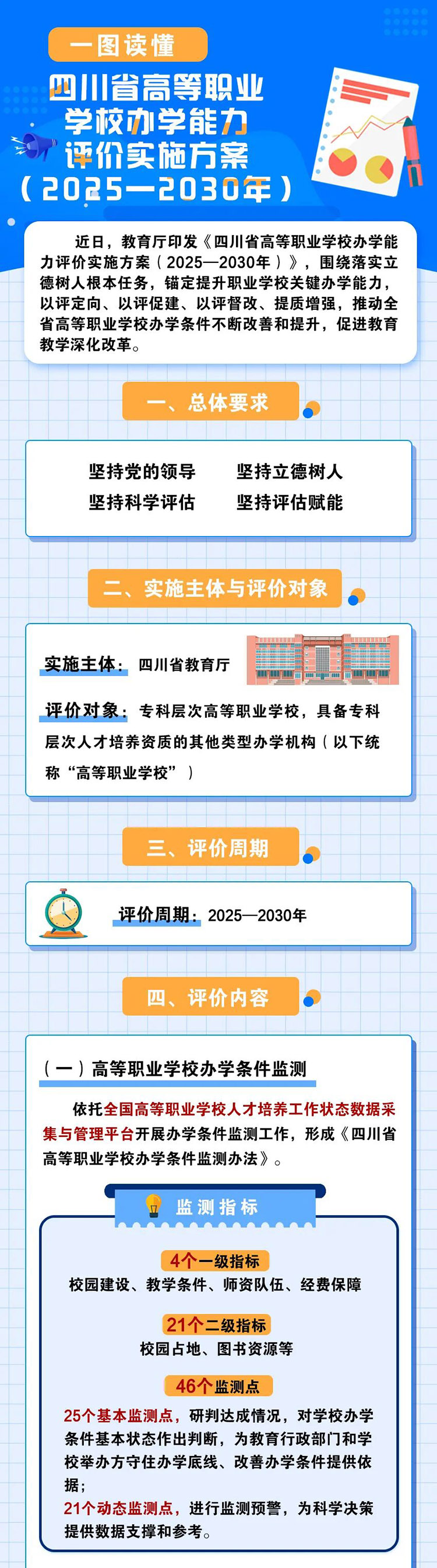近日,四川省教育厅印发《四川省高等职业学校办学能力评价实施方案(2025—2030年)》,围绕落实立德树人根本任务,锚定提升职业学校关键办学能力,以评定向、以评促建、以评督改、提质增强,推动全省高等职业学校办学条件不断改善和提升,促进教育教学深化改革。
