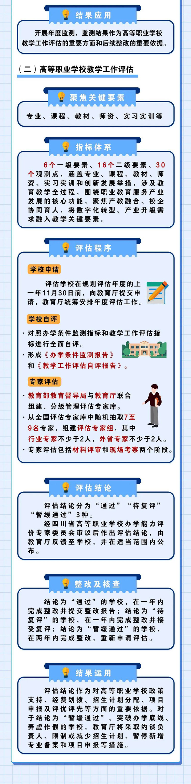 同时,四川省教育厅强调,评估结论作为对高等职业学校政策支持、经费划拨、招生计划分配、项目申报及评优评先等方面的重要依据。对于结论为“暂缓通过”、突破办学底线弄虚作假的学校,教育厅将采取约谈负责人、限制或减少招生计划、暂停新增专业备案和项目申报等措施。