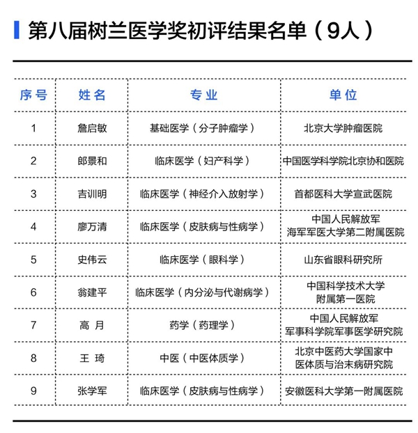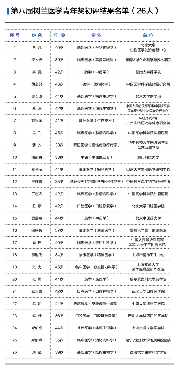 在国家科技部、教育部、卫生健康委、中国工程院和浙江大学等各级领导部门的高度重视和指导下,第八届树兰医学奖初评工作已顺利结束。根据《树兰医学奖章程》和《树兰医学奖章程实施细则》的规定,树兰基金秘书处将形式审查合格的提名材料提交初评委员会进行评审。初评委员会由中华医学会、中国医师协会、中国药学会、中华预防医学会、中华口腔医学会等国家级学术组织推荐的著名医学专家构成。初评委员会经过材料审阅、专业组评审、投票等程序,从129位被提名人中产生了进入终评的有效候选人35位。现予以公布,欢迎社会各界监督。