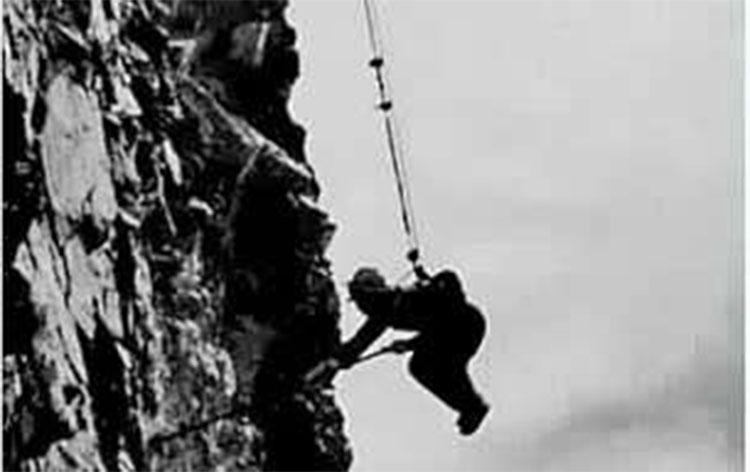 施工时,战士们系着一条安全绳,悬在半空,排除碎石,脚下是万丈深渊。