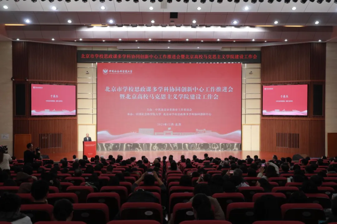 12月26日,北京市学校思政课多学科协同创新中心工作推进会暨北京高校马克思主义学院建设工作会在中国社会科学院大学举办。会议旨在深入学习贯彻党的二十届四中全会精神,进一步发挥中国社会科学院学科资源优势,大力推进我市高校马院高质量发展,为教育强国首善之区建设锻造强大思政引领力。市委常委、教育工委书记于英杰,中国社会科学院副院长、党组成员赵芮出席,中国社会科学院、市委教育工委、市委宣传部相关负责同志,北京高校分管校领导、马克思主义学院师生代表400余人参会。