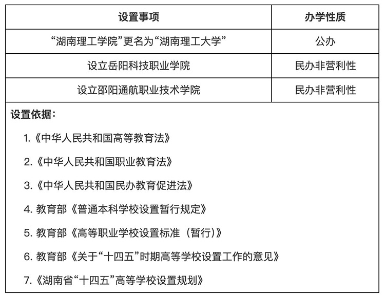 公示显示,根据《湖南省“十四五”高等学校设置规划》,经省第四届高等学校设置评议委员会专家组现场考察、集体评议,现将湖南理工学院更名为湖南理工大学、新设立岳阳科技职业学院、新设立邵阳通航职业技术学院予以公示。公示时间为2025年3月12日至2025年3月18日。