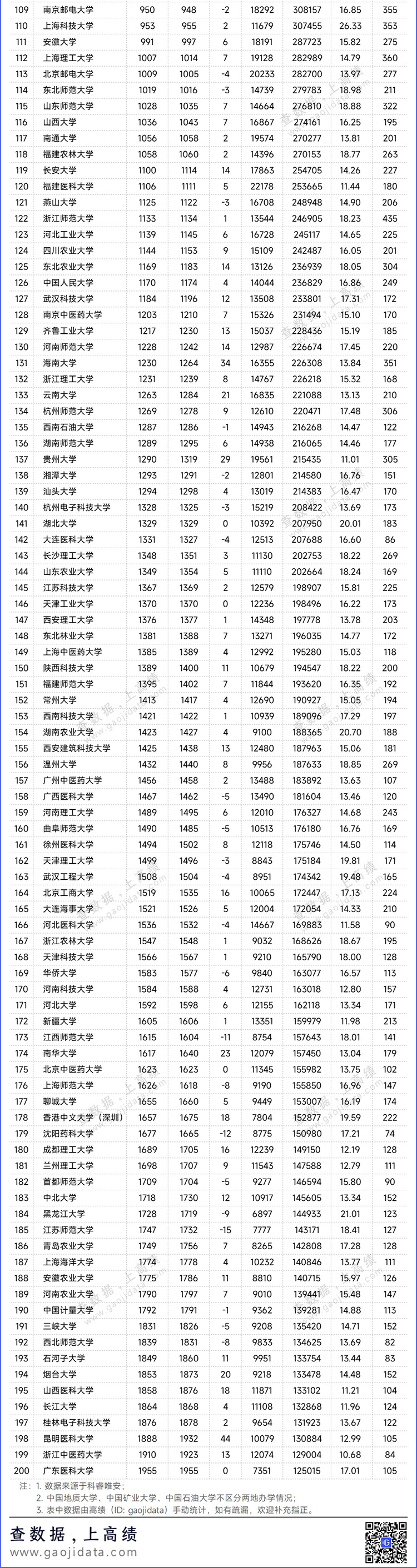 国际排名前200的高校还有中山大学、华中科技大学、复旦大学、中国科学技术大学、中南大学、四川大学、南京大学、武汉大学、西安交通大学、哈尔滨工业大学、山东大学、天津大学、同济大学、华南理工大学、吉林大学、东南大学和郑州大学。