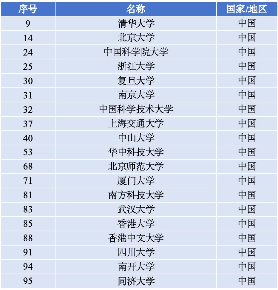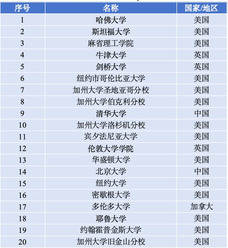 美国的顶尖高校在榜单中占据了显著位置,哈佛大学、斯坦福大学、麻省理工学院分别位列第1、第2、第3名,纽约市哥伦比亚大学、加州大学圣地亚哥分校、加州大学伯克利分校、加州大学洛杉矶分校等也都排名靠前。