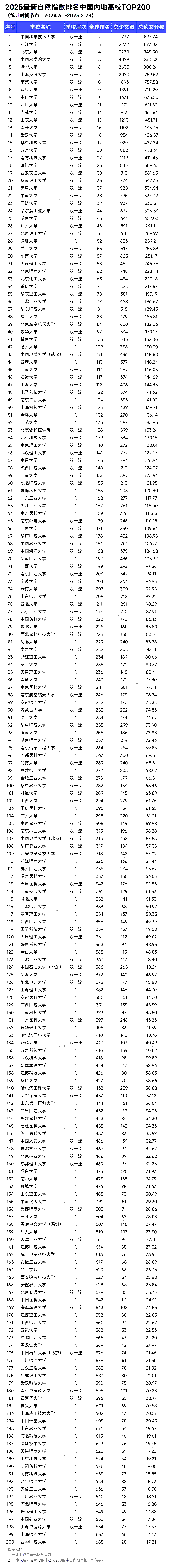 最新自然指数排名(统计时间节点为2024.3.1-2025.2.28)