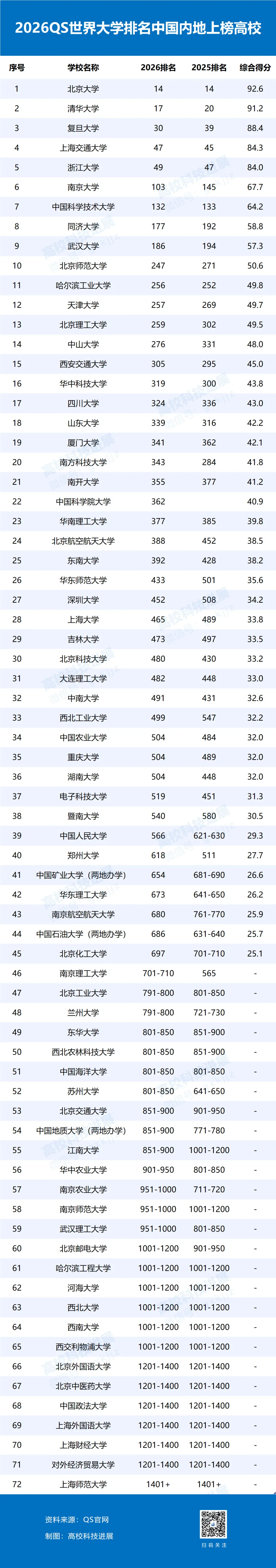 ·中国(内地)高校的发展势头依然强劲,在今年的排名中,约45%的高校排名有所上升,北京大学稳居全球第14名,清华大学上升至全球第17名,复旦大学则前进9位,排名全球第30名。目前,中国(内地)已有5所高校跻身全球前一百。