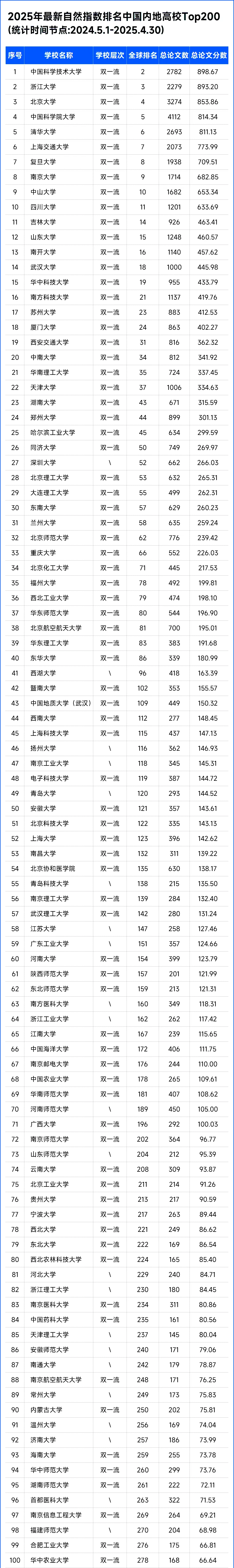 2025年最新自然指数排名中国内地高校top200名单如下: