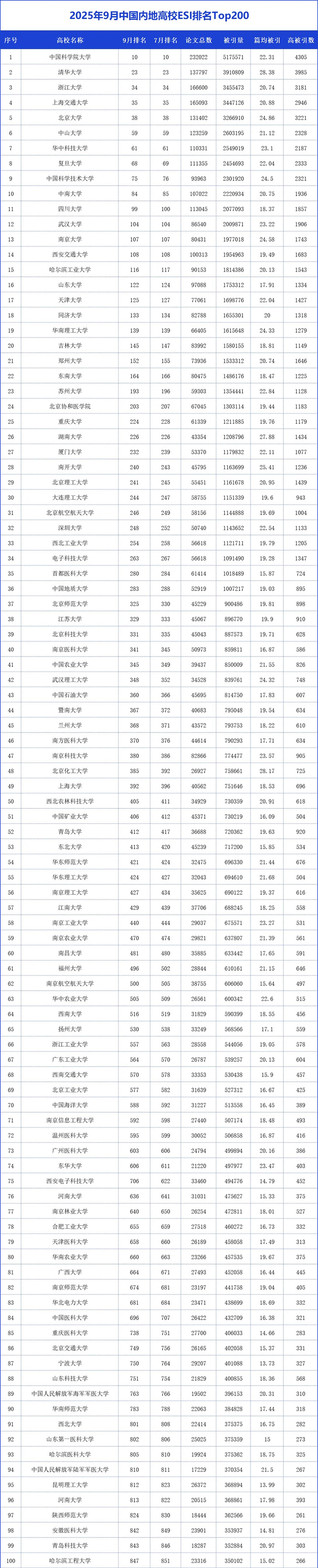 9月11日,科睿唯安(clarivate analytics)公布了2025年9月的esi最新数据。从统计数据来看,本期(2025年9月)top200高校esi综合排名相比上一期(2025年7月)略有进步。