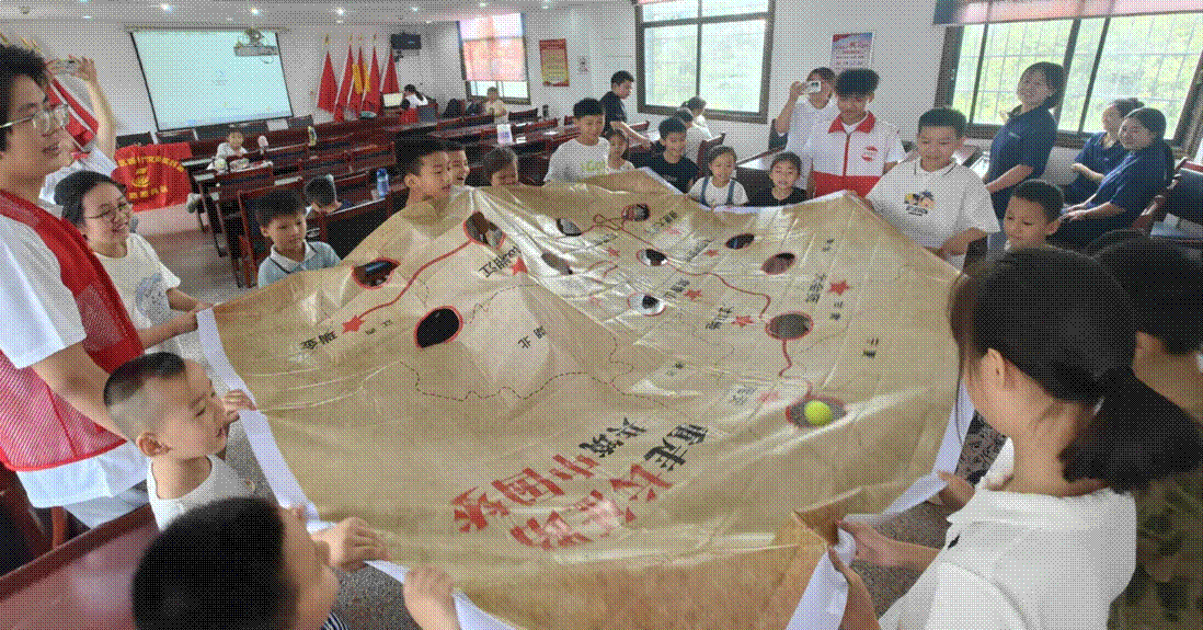 红色教育润童心,基因传承有新意。团队以“用情传史”为理念,让红色精神在互动中浸润孩子们的心灵。在“长征足迹”主题活动中,成员们创新形式,通过趣味互动让历史“活”起来:孩子们合力扯着皮布滚动小球,球到一处,便聆听一段长征故事;课本里的红色篇章被搬上“舞台”,孩子们化身故事主角参与角色扮演。生动的体验让孩子们触摸到历史的温度,红色基因不再是遥远的符号,而是融入血脉的传承。每当《五星红旗迎风飘扬》的歌声在课堂响起,孩子们眼中的自豪与激昂便感染着在场每一个人,这份纯粹的爱国情怀,成为暑期课堂里最动人的旋律。