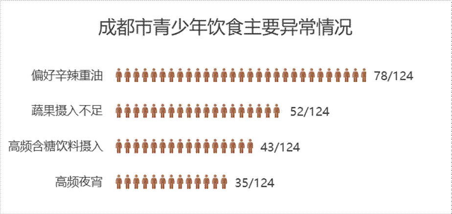 为精准设计支教课程,团队前期开展了扎实的健康调研。核心发现精要: 调研显示,成都当地居民存在高油烹饪(超84%)、食盐易超量(约28%)、主食偏精细(超66%)及常食腌制食品(约46%) 等饮食习惯,青少年群体则突出表现为 体重认知偏差大、偏好辛辣重油(超62%)、蔬果摄入不足(超41%<200g/天)及含糖饮料/宵夜高频(均超28%)。
