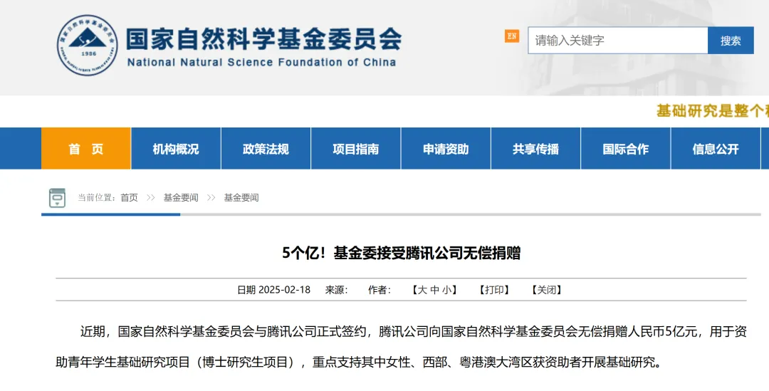 腾讯向国家自然科学基金委员会捐赠5亿元
