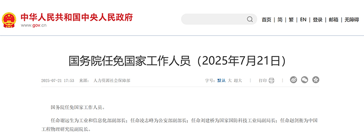 7月21日,国务院任免国家工作人员。任命谢远生为工业和信息化部副部长;任命凌志峰为公安部副部长;任命刘建桥为国家国防科技工业局副局长;任命赵剑衡为中国工程物理研究院副院长。