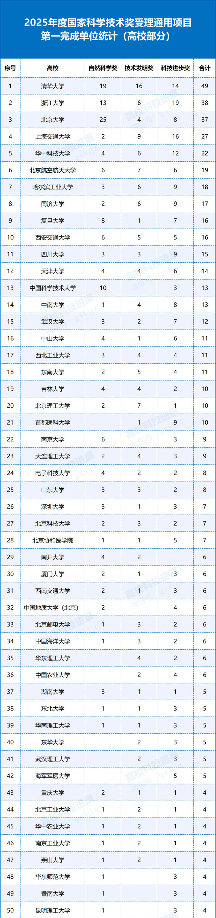 国家自然科学奖项目中,北京大学25项拟入选,清华大学19项,浙江大学13项,中国科学技术大学10项,复旦大学8项,北京航空航天大学、西安交通大学和南京大学各有6项拟入选。