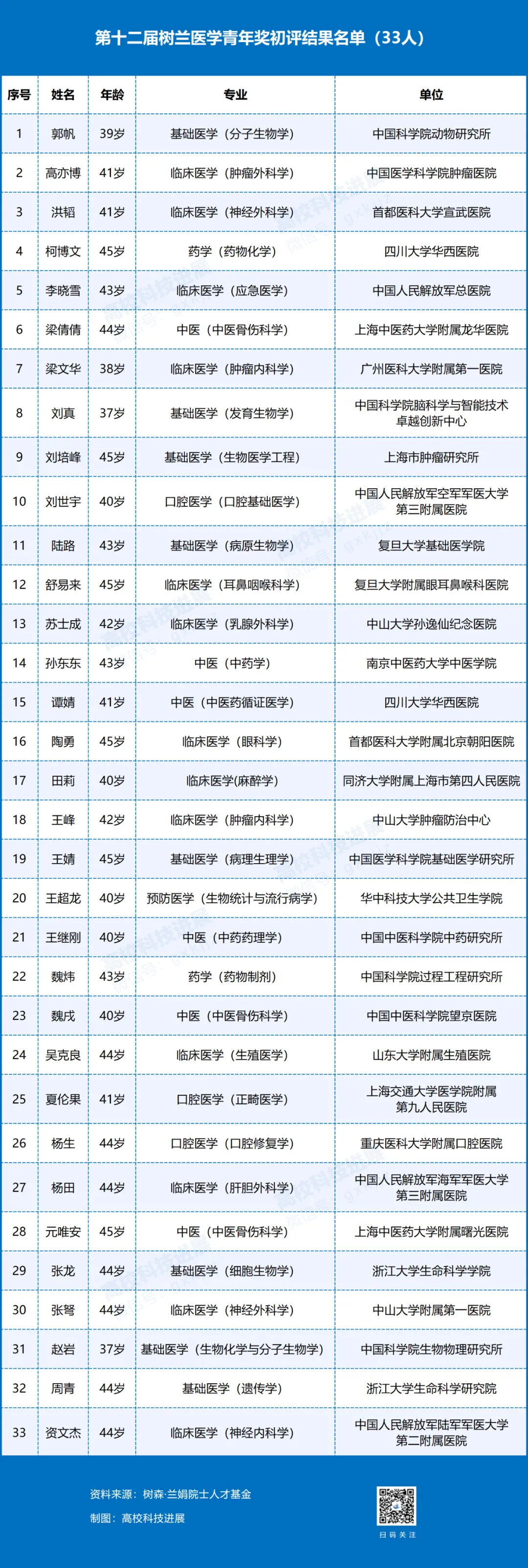 9月19日,第十二届树兰医学奖初评结果名单公示,初评委员会经过材料审阅、专业组评审、投票等程序,从180位被提名人中产生43位有效候选人进入终评会议。