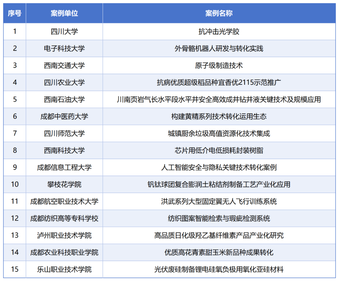 近日,四川省教育厅公布高校科技成果转化典型案例。为深入贯彻落实国家创新驱动发展战略,进一步推动四川省高校科技成果转移转化,总结推广先进经验,发挥典型示范引领作用,营造崇尚创新、鼓励转化的良好氛围,根据《四川省教育厅关于征集高校科技成果转化典型案例的通知》安排,经高校申报、专家评审、网上公示、教育厅审定等程序,遴选出“四川省高校科技成果转化典型案例”15个。