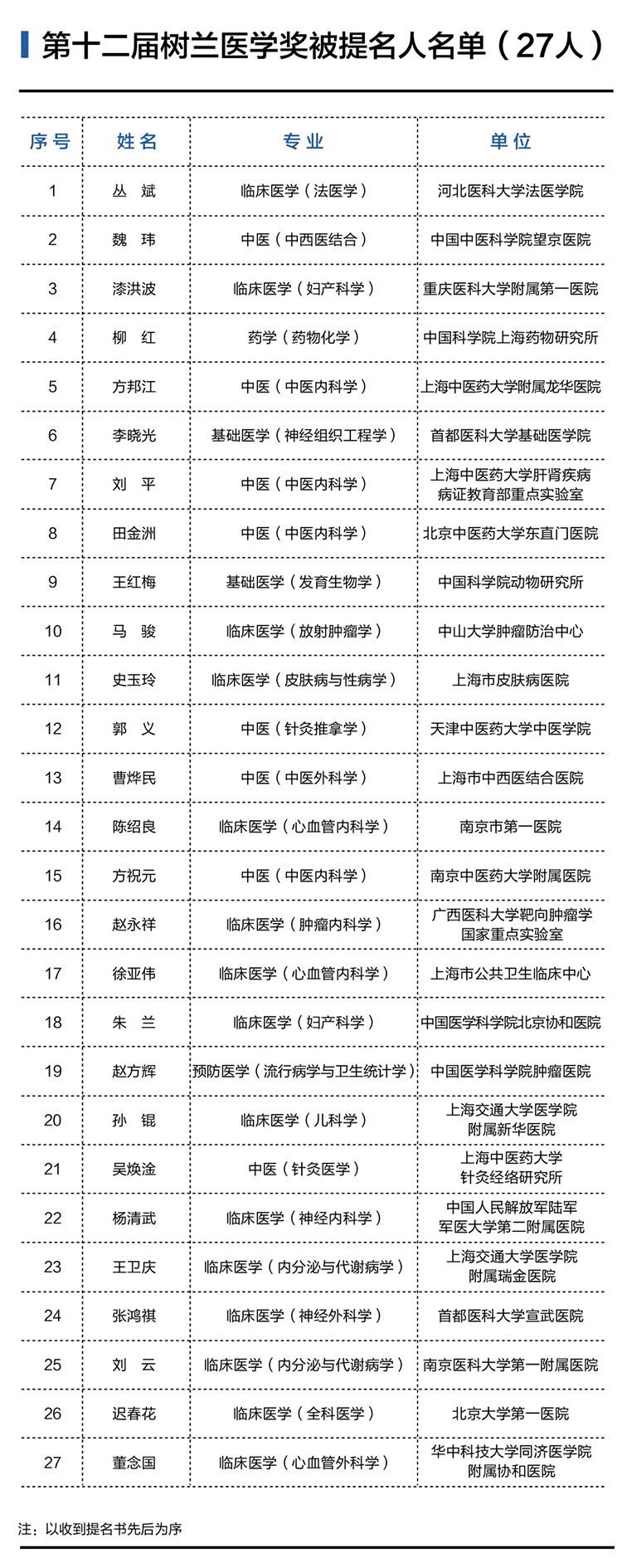 提名工作得到中华医学会、中国医师协会、中国中西医结合学会、中国抗癌协会、中国药学会、中华中医药学会、中华预防医学会、中华口腔医学会等20个国家级学术机构的关心和参与;94位两院院士、160名学会(协会)主任委员(会长)积极提名;经过形式审查和有关工作程序,共计180位树兰医学奖被提名人,其中27位树兰医学奖被提名人、153位树兰医学青年奖被提名人;被提名人涵盖6个一级医学学科,其中临床医学73人、基础医学40人、预防医学9人、口腔医学13人、药学10人、中医35人。