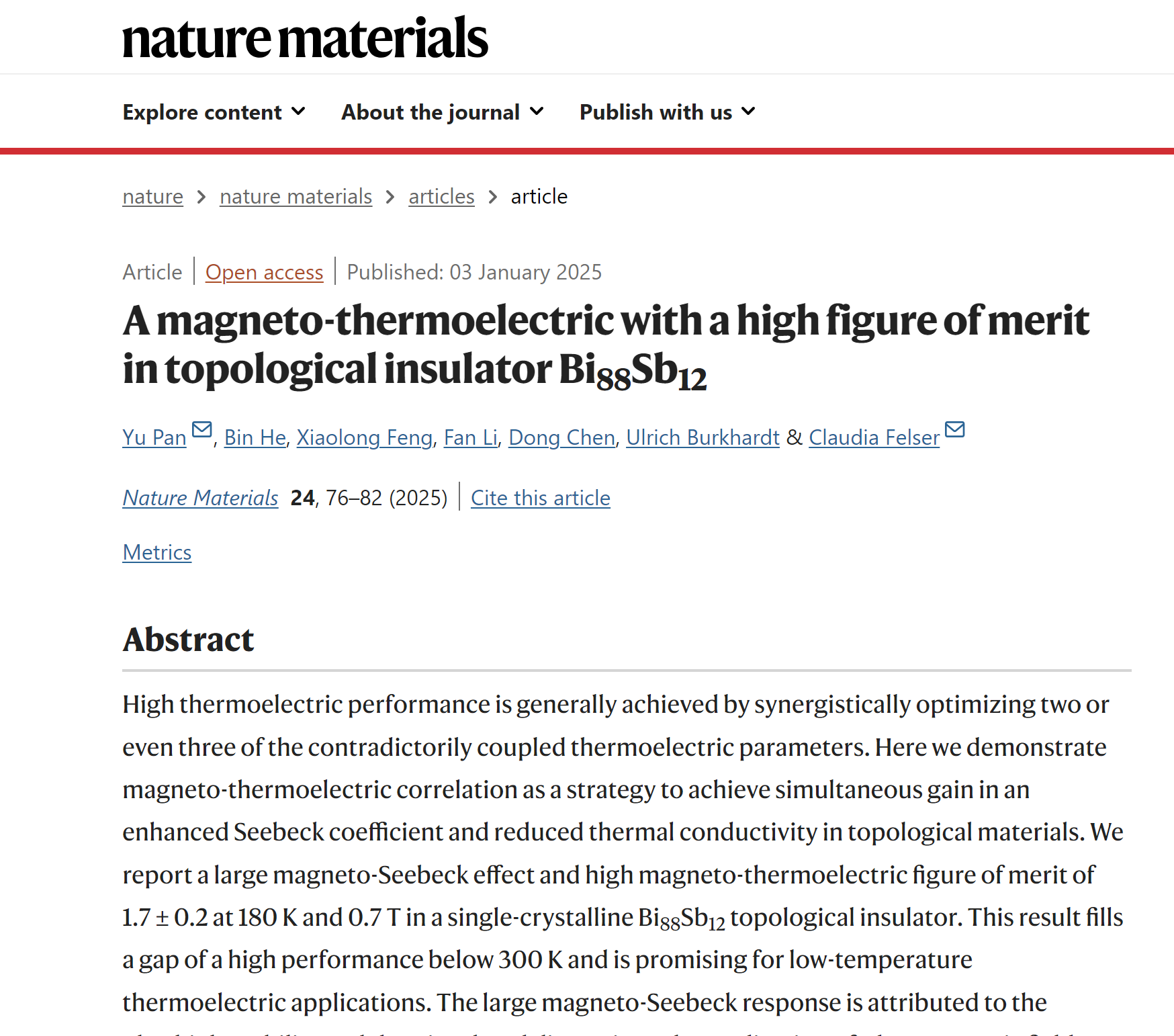 北京时间2025年1月3日,重庆大学前沿交叉学科研究院量子材料与器件研究中心、材料科学与工程学院潘瑜教授在国际顶级期刊《自然材料》(nature materials)发表最新研究成果。论文题目为《具有优异磁-热电优值的bi88sb12拓扑绝缘体》(a magneto-thermoelectric with a high figure of merit in topological insulator bi88sb12 )。潘瑜教授为第一作者、通讯作者,重庆大学为第二完成单位、通讯单位,德国马普固体化学物理研究所为第一完成单位,合作单位还包括马普微结构物理研究所、重庆大学物理学院。