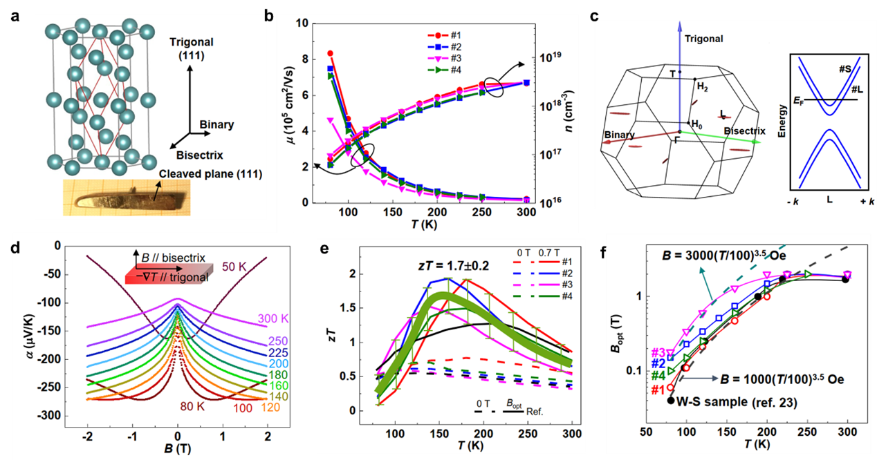 图1 (a) 晶体结构与单晶照片,(b)迁移率与载流子浓度,(c)费米面分布与能带劈裂示意图,(d)磁-塞贝克系数,(e)zt值,(f)最佳磁场与温度的依赖关系。