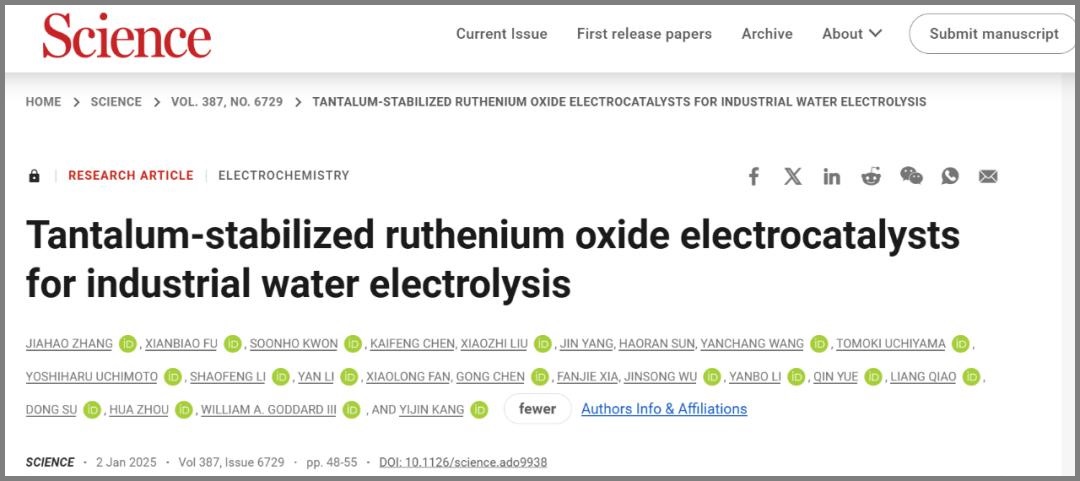 近日,四川大学化学工程学院康毅进教授团队联合加州理工学院william a. goddard教授团队在《science》发表了题为“tantalum-stabilized ruthenium oxide electrocatalystsfor industrial water electrolysis”的文章。
